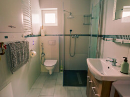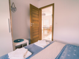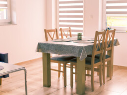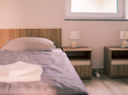 “Między ciszą a ciszą” to dwa wolnostojące, całoroczne domki parterowe wybudowane w technologii tradycyjnej. Układ pomieszczeń jak i powierzchnia użytkowa jest taka sama w obydwu domkach. Budynki są przystosowane do komfortowego przebywania czterech osób (możliwy nocleg piątej osoby na rozkładanym narożniku w pokoju dziennym). W obu domkach znajdują się dwie sypialnie (9,00m2 każda), pokój dzienny z aneksem kuchennym (19,50m2), łazienka (3,68m2), przedpokój (3,12m2) oraz ganek (2,07m2). Ściany pomieszczeń są pomalowane na biało, podłogi wykończone terakotą z ogrzewaniem podłogowym. Łazienka została wyposażona w niezbędną armaturę sanitarną. Z pokoju dziennego, drzwiami balkonowymi jest wyjście bezpośrednio na taras.